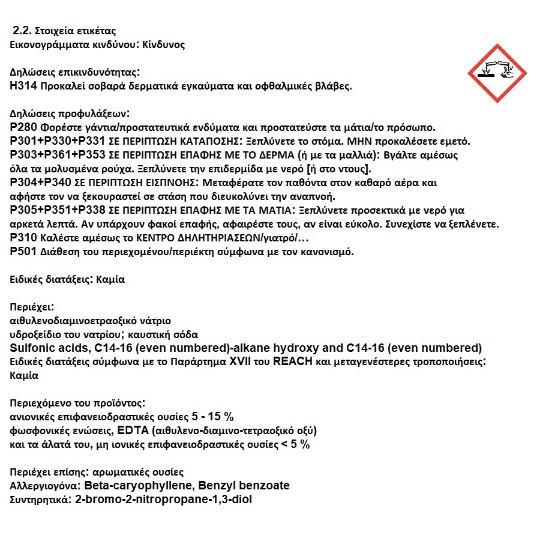 Δεν περιέχει ΝΤΑ (νιτριλοτριοξικό οξύ) / potassium hydroxide (υδροξειδίου του καλίου), είναι αντιδιαβρωτικό και ανθεκτικό στα σκληρά νερά.