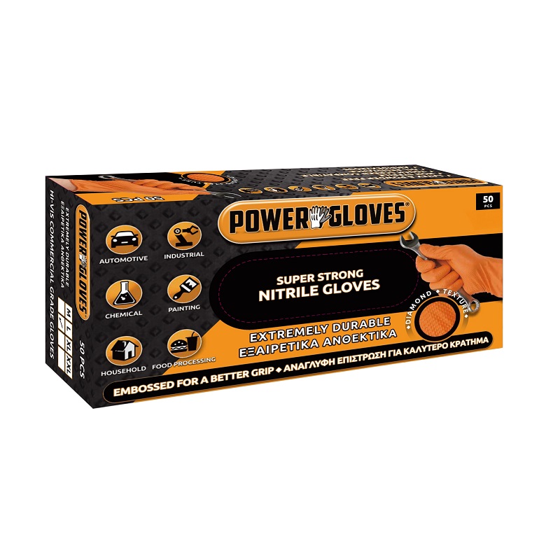 Πορτοκαλί γάντια με ανάγλυφο καρό μοτίβο, κατασκευασμένα από νιτρίλιο χωρίς λατέξ, που προσφέρουν εξαιρετική αντοχή στα λάδια και υψηλή ανθεκτικότητα. Το ανάγλυφο σχέδιό του εξασφαλίζει ανώτερο κράτημα σε υγρές ή λιπαρές επιφάνειες, ενώ το έντονο πορτοκαλί χρώμα ενισχύει την ορατότητα και την ασφάλεια.